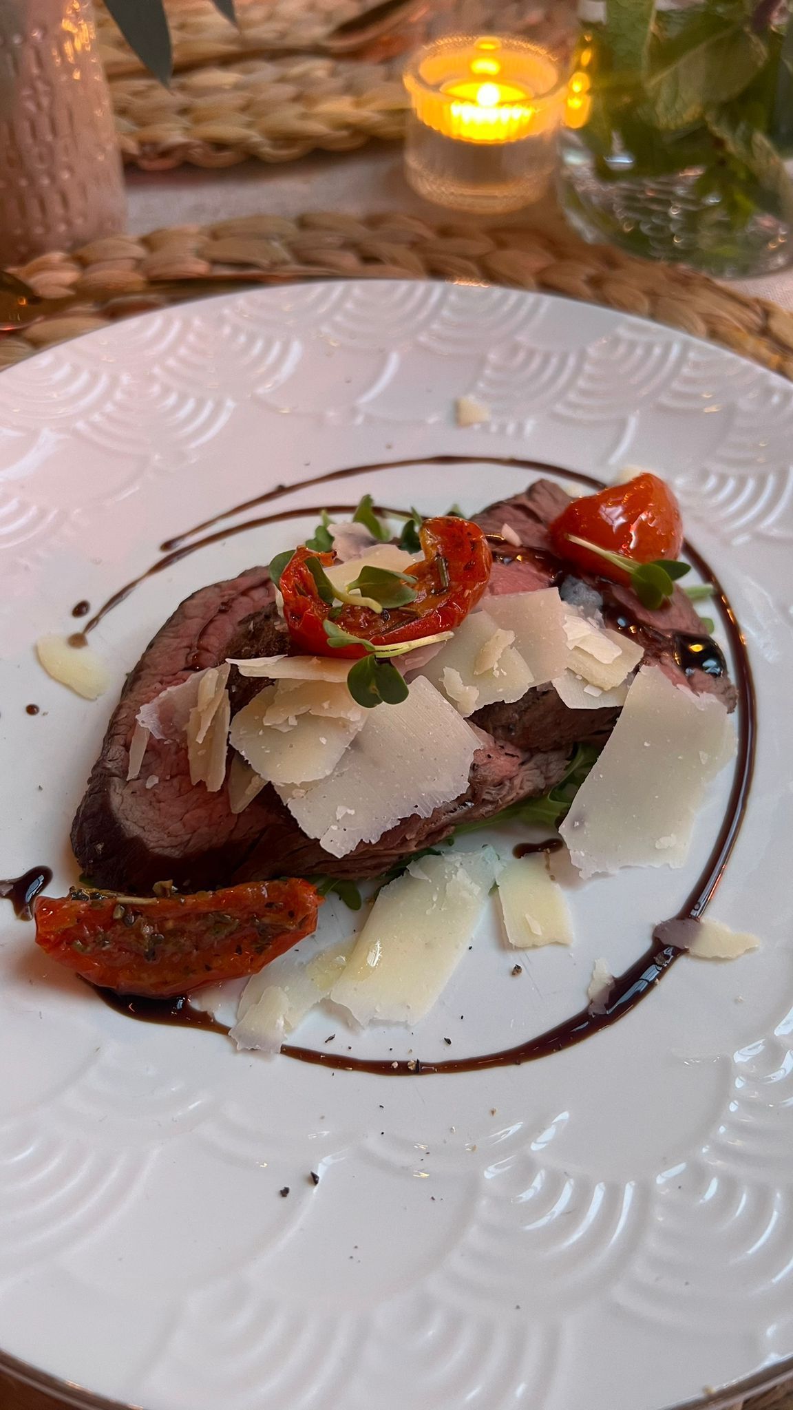 Voorgerecht: Rundercarpaccio – truffelmayo – pijnboompitjes – zongedroogde tomaatjes - parmezaan
