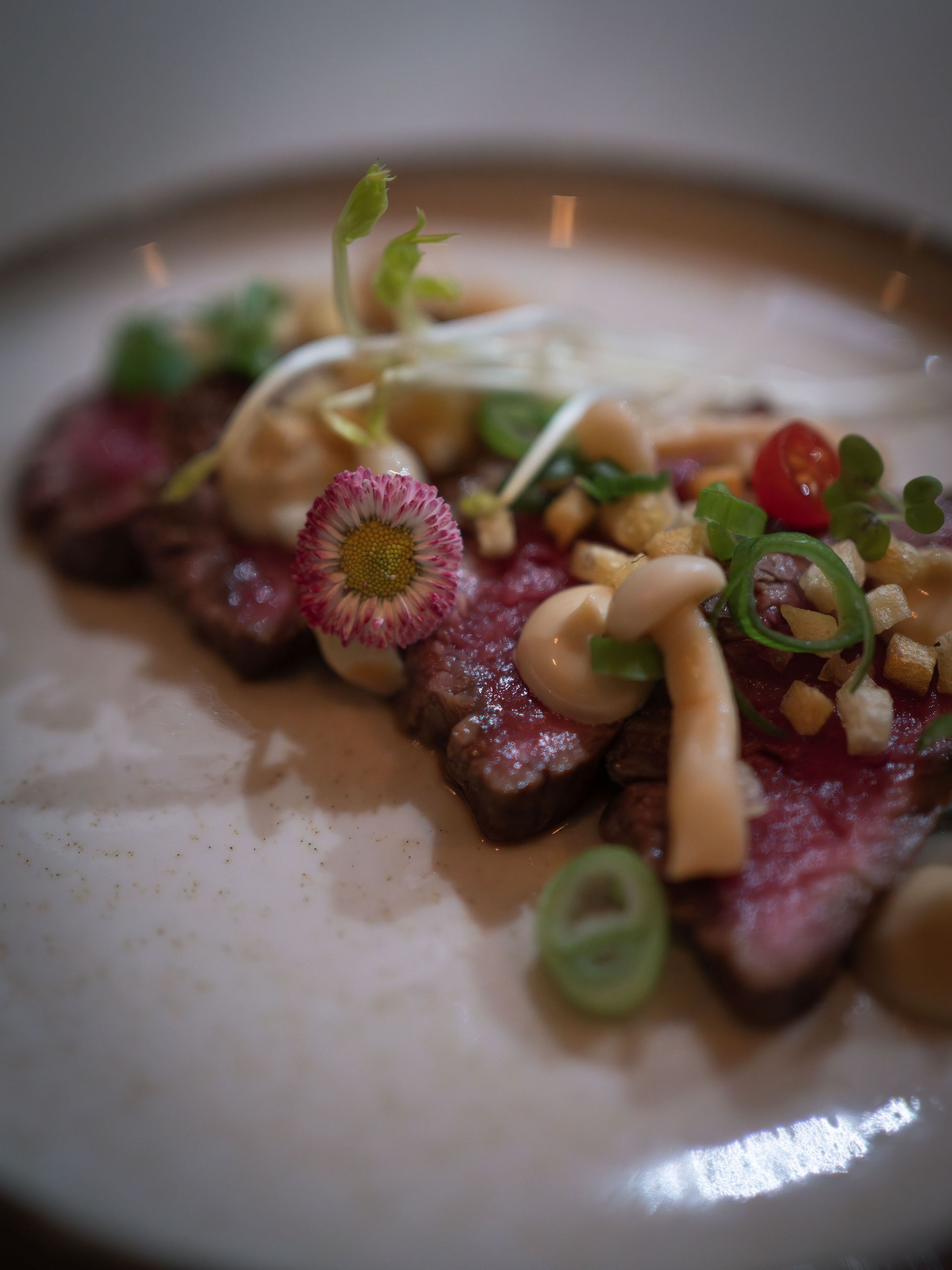 - Beef tataki Japanse mayo beukenzwammetjes soja parels wasabi crumble bosui