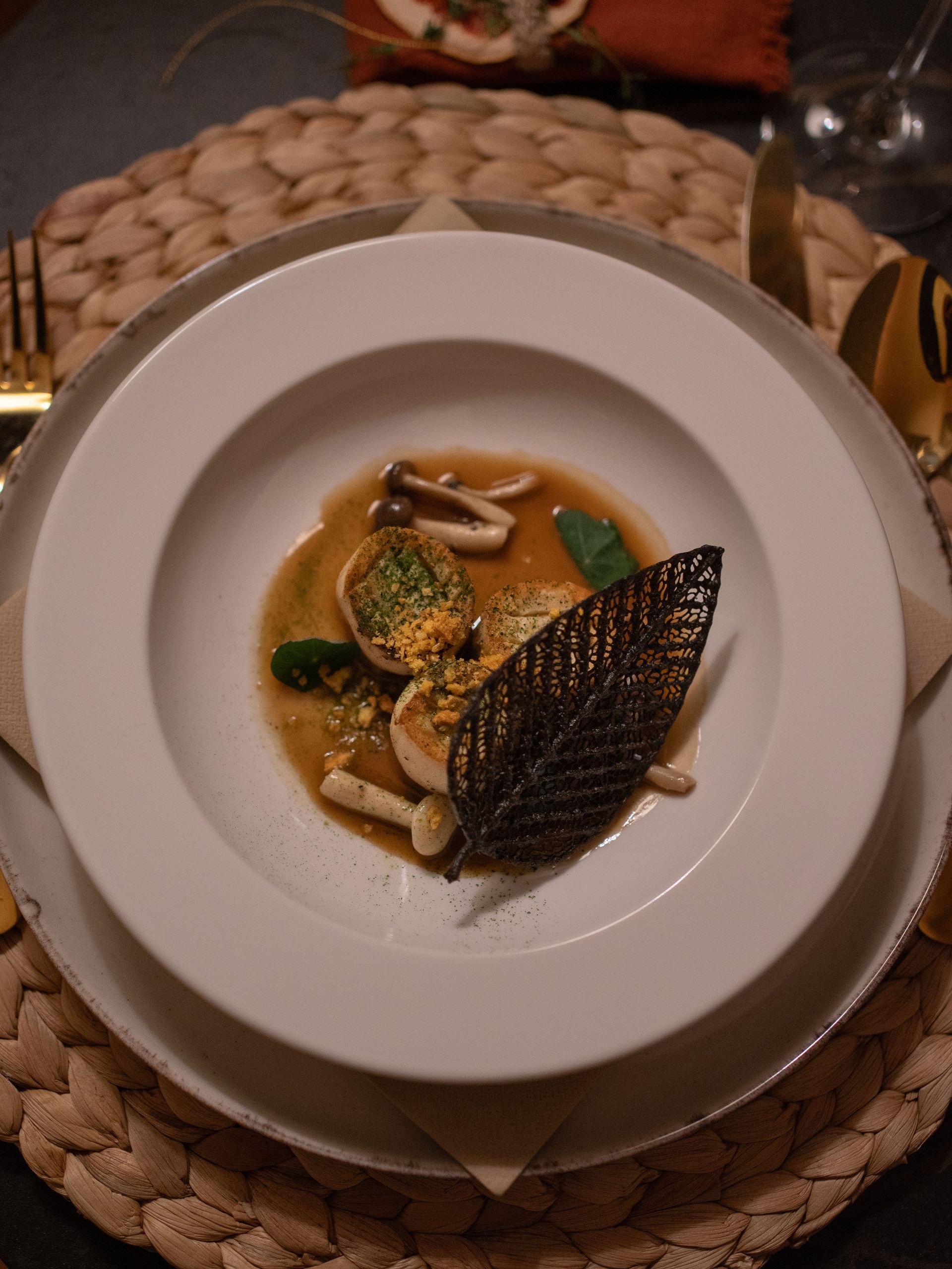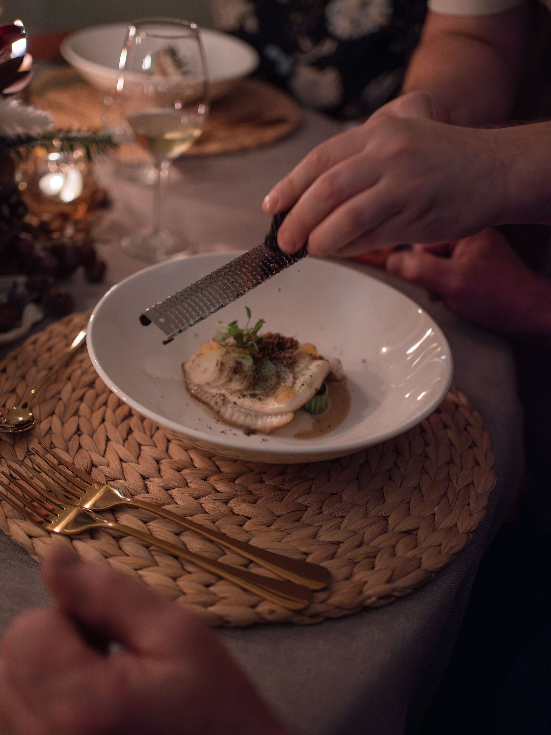 Schol met aardpeer | truffel | zwarte knoflook beurre blanc | creme van aardpeer | prei